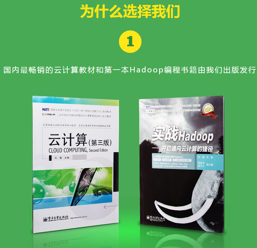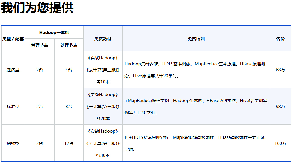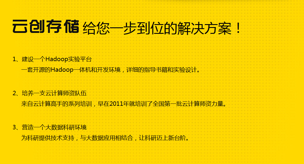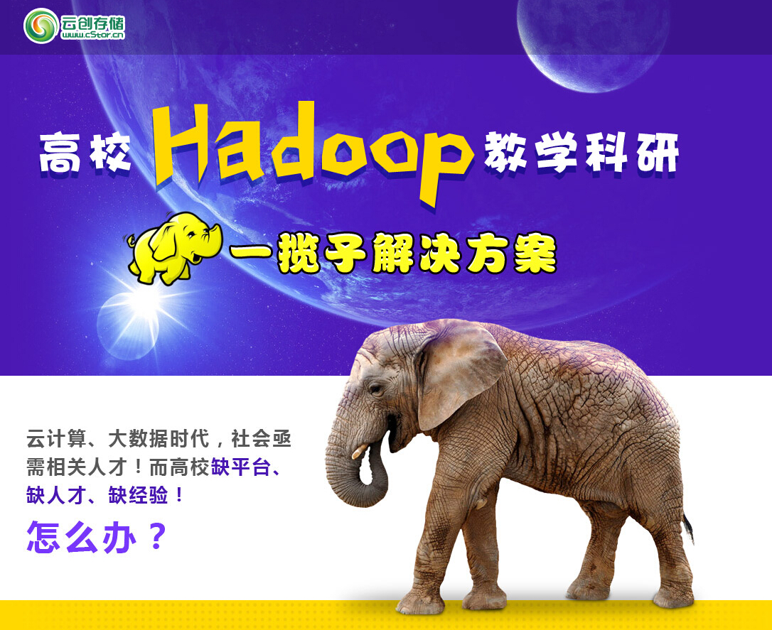云计算很热!大数据很热!学习云计算、大数据,从hadoop开始!整个社会亟需大量的云计算、大数据技术人才,而高校人才培养体系与此脱节。高校缺平 台、缺人才、缺经验,怎么办?为您推荐Hadoop教学、科研一揽子解决方案,解决所有您操心的问题:平台、教材、培训、服务等。