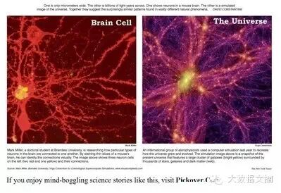 这是《纽约时报》刊登的2张照片,一张是老鼠的脑细胞(左),一张是宇宙(右)。早期宇宙中星系互连关系,和大脑神经元相互连接,几乎无法分辨两张图之间的不同,大脑细胞与整个宇宙拥有一样的结构。