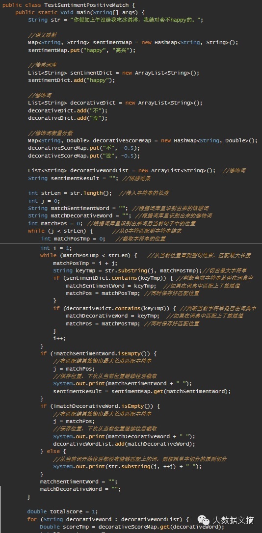 对于文章一开始提到的问题还没解决,如何让程序识别文本中的感情色彩。现在我们先要构建一个感情色彩词库“高兴”,修饰词库“没”、”不”。再完善一下我们的程序: