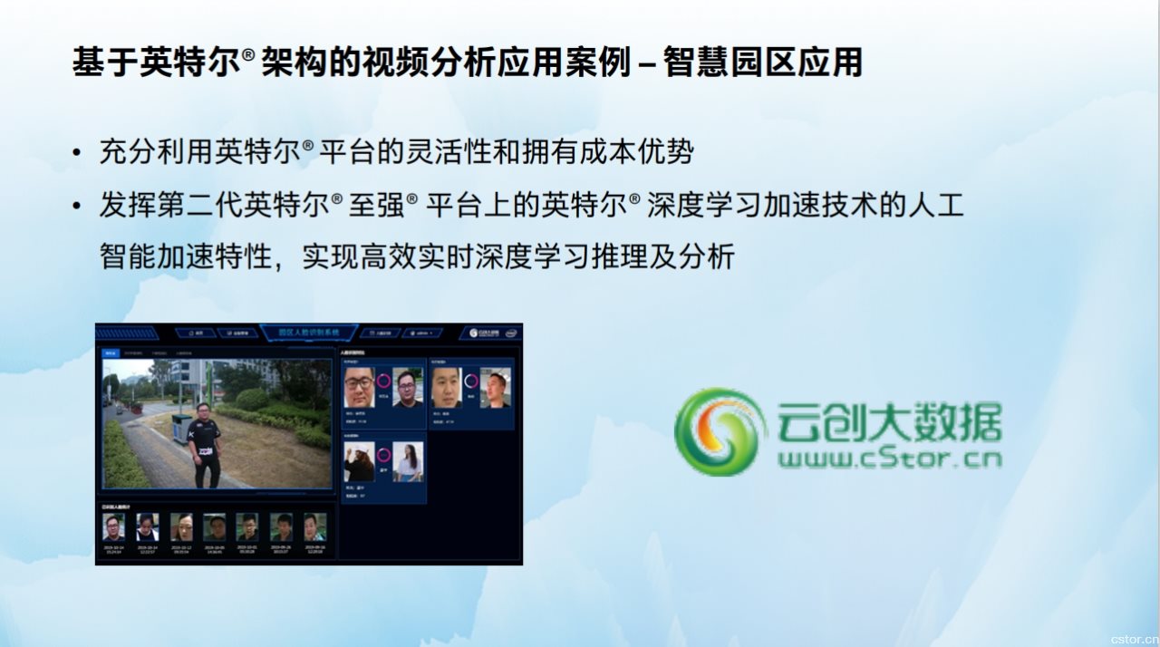 值得一提的是,云创大数据的智慧园区人脸识别系统、铁路病态非接触检测系统这两款热门产品,在市场上收获行业用户的颇多好评。其实,这两款产品都是云创大数据前沿应用结合英特尔先进技术成功落地的人工智能具体实例。此外,在云创大数据参与的新冠肺炎疫情走势预测中,也离不开英特尔提供的人工智能技术支持。